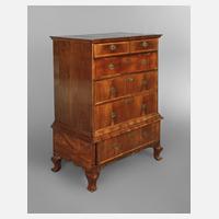 England, Mitte 18. Jh., Nussbaum und Nussbaumwurzel furniert, zweiteiliger Korpus mit insgesamt sechs Schüben, originale gravierte Messingbeschläge, alt restauriert, Rückwand des Aufsatzes erneuert, Furnierschäden, rest.bed., Maße 127 x 98 x 54 cm.