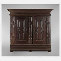 1. Hälfte 18. Jh., Eiche massiv, dunkelbraun gebeizt, zerlegbarer zweitüriger Korpus mit abgeschrägten Ecken, Türen mit Bastionsfüllungen, imitierte Schubkästen mit schweren Messingbeschlägen, alt restauriert, Schloss ergänzt, Maße 215 x 178 x 67 cm.