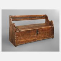 im gotischen Stil, 18./19. Jh., Buche massiv, allseitig mit geometrischer Oberflächenschnitzerei verziert, partiell ebonisiert, Deckel mit Holzscharnier, alle Teile holzgedübelt, stärkere Schäden durch Holzwurmbefall, rest.bed., Maße 86 x 104 x 60 cm.