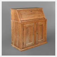 Ende 18. Jh., Eiche massiv, zweitüriger Korpus mit drei kleinen Schubkästen, seitlich kassettiert, die Front floral beschnitzt, innen ein feststehender Regalboden, die kannelierte Lisene mittig, später mit der linken Tür verbunden, alt restauriert, Schlösser teilweise ergänzt, Schlüssel fehlt, alt restauriert, Maße 122 x 147 x 49 cm.