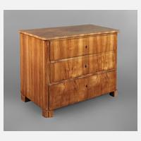 Mitte 18. Jh., Nussbaum und Nussbaummaser auf Nadelholz furniert, dreischübiger Korpus mit doppelt gebauchter Front, originale Messingbeschläge, die Schlösser alt ergänzt, bis zu 3 mm starkes Sägefurnier, Furnierfehler an Front und linker Seite, etwas rest.bed., Maße 83 x 117 x 69 cm.