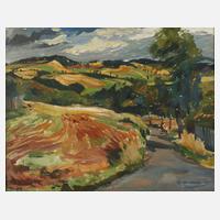 Blick entlang einer Allee in sanft bewegte Hügellandschaft mit reifenden Feldern, Wiesen und Wäldern, expressive, gering pastose Landschaftsmalerei mit breitem Pinselduktus, Öl auf Platte, rechts unten signiert und datiert "R. Andiel [19]67", rückseitig Rahmungsetikett "Bilder Geyer ... Plauen", sehr schön schlicht gerahmt, Falzmaße ca. 60 x 74,5 cm. Künstlerinfo: dt. Maler und Graphiker (1927 Plauen bis 1992 Plauen), Lehre als Entwerfer, studierte 1942-44 an der Staatlichen Meisterschule für Textilindustrie (Kunstschule) Plauen, 1950-53 Tätigkeit als Plakat- und Dekorationsmaler, studierte 1953-58 an der Hochschule der Bildenden Künste (HBK) Dresden bei Erich Fraaß und Rudolf Bergander, anschließend freischaffend in Plauen, ab 1959 Mitglied des Verbandes Bildender Künstler (VBK) der DDR, ab 1960 Zirkelleiter und Betriebsvertrag mit der Plamag Plauen, beschickte zahlreiche Ausstellungen, unter anderem die Kunstausstellungen der DDR, 1990 Gründungsmitglied des Plauener Kunstvereins, tätig in Plauen, Quelle: Frank Weiß "Malerei im Vogtland", Eisold “Künstler in der DDR”, AKL, Wikipedia und Internet.