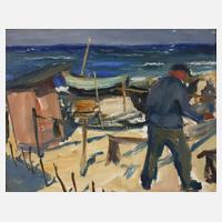 Fischer am sommerlich-sonnigen Strand bei der Reparatur der Netze, studienhaft-flott erfasste, pastose Malerei mit breitem Pinselduktus, Öl auf Karton, um 1960, unsigniert, laut Vorbesitzerangabe Gemälde von Rolf Andiel, schlicht gerahmt, Falzmaße ca. 33,5 x 42 cm. Künstlerinfo: dt. Maler und Graphiker (1927 Plauen bis 1992 Plauen), Lehre als Entwerfer, studierte 1942-44 an der Staatlichen Meisterschule für Textilindustrie (Kunstschule) Plauen, 1950-53 Tätigkeit als Plakat- und Dekorationsmaler, studierte 1953-58 an der Hochschule der Bildenden Künste (HBK) Dresden bei Erich Fraaß und Rudolf Bergander, anschließend freischaffend in Plauen, ab 1959 Mitglied des Verbandes Bildender Künstler (VBK) der DDR, ab 1960 Zirkelleiter und Betriebsvertrag mit der Plamag Plauen, beschickte zahlreiche Ausstellungen, unter anderem die Kunstausstellungen der DDR, 1990 Gründungsmitglied des Plauener Kunstvereins, tätig in Plauen, Quelle: Frank Weiß "Malerei im Vogtland", Eisold “Künstler in der DDR”, AKL, Wikipedia und Internet.