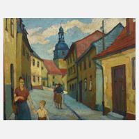 Blick in kleinstädtische Gasse mit Passanten, hin zum imposanten Turm der evangelischen St.-Nicolai-Kirche, pastose Malerei mit breitem Pinselduktus, Öl auf Malkarton, um 1959, rückseitig von Rolf Andiel bezeichnet "Abs. R. Andiel, Dresden A20, Winterbergstr. 2 (? weiter nicht lesbar, da von Klebestreifen verdeckt)" und Rahmungsetikett "Bilder-Rahmen Müller Plauen ...", Malgrund etwas wellig, gering reinigungsbedürftig, gerahmt, Falzmaße ca. 50 x 62,5 cm. Künstlerinfo: dt. Maler und Graphiker (1927 Plauen bis 1992 Plauen), Lehre als Entwerfer, studierte 1942–44 an der Staatlichen Meisterschule für Textilindustrie (Kunstschule) Plauen, 1950–53 Tätigkeit als Plakat- und Dekorationsmaler, studierte 1953–58 an der Hochschule der Bildenden Künste (HBK) Dresden bei Erich Fraaß und Rudolf Bergander, anschließend freischaffend in Plauen, ab 1959 Mitglied des Verbandes Bildender Künstler (VBK) der DDR, ab 1960 Zirkelleiter und Betriebsvertrag mit der Plamag Plauen, beschickte zahlreiche Ausstellungen, unter anderem die Kunstausstellungen der DDR, 1990 Gründungsmitglied des Plauener Kunstvereins, tätig in Plauen, Quelle: Frank Weiß "Malerei im Vogtland", Eisold “Künstler in der DDR”, AKL, Wikipedia und Internet.