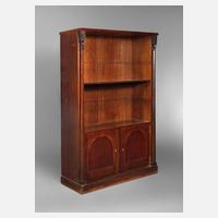 um 1905, Mahagoni auf Nadelholz furniert, seitlich flankiert von konisch zulaufenden, achtfach facettierten Säulen mit floral beschnitztem Kapitell, zweitüriges Unterteil, nur ein höhenverstellbarer Regalboden vorhanden, Schlüssel fehlen, Schlagleiste gebrochen, restaurierungsbedürftig, Maße 181 x 122 x 46 cm.