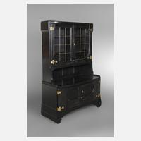 Entwurf 1902/03, Ausführung um 1909, Deutsche Werkstätten für Handwerkskunst Dresden-Hellerau, Eiche massiv und furniert, originale Eisenbeschläge poliert, zweitüriger Korpus mit abgeschrägten Ecken, mit breitem Schubfach und ausziehbarer Arbeitsfläche, Platte mit abnehmbarer flacher Konsole, wohnfertig restauriert, mit Schlüssel, Maße 96 x 120 x 63 cm. Quelle: Klaus-Peter Arnold, Vom Sofakissen zum Städtebau, 1993, vgl. S. 147 und 463, Kat.-Nr. 219, Winfried Nerdinger, Hrsg., Richard Riemerschmid Vom Jugendstil zum Werkbund, 1983, vgl. S. 131 und 158, Kat.-Nr. 86b, S. 160, Kat.-Nr. 88b, vgl. Beschläge.