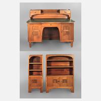 Entwurf 1904 für das Wohnzimmer Haus Edel, Mahagoni massiv und teilweise auf Nadelholz furniert, Ausführung Deutsche Werkstätten für Handwerkskunst Dresden-Hellerau, bestehend aus Schreibtisch mit Aufsatz, einem schmalen und einem breiten Bücherregal, beide jeweils mit Türen im Sockel und jeweils zwei an Fachbodenhalter verstellbare Regalböden, Schreibtisch mit originalem grünen Linoleumbelag, die linke Seite mit vier Auszügen, rechts mit Einlegeböden (diese fehlen), die vorderen Füße nicht original, ein Fuß lose, restaurierungsbedürftig, Maße Schreibtisch 106 x 139 x 72 cm, Regale 130 x 100 bzw. 50 x 22 cm. Quelle: Richard Riemerschmid, Vom Jugendstil zum Werkbund, S. 185, für den Schreibtisch siehe auch: Kreisel/Himmelheber S. 386, Abb. 1060, sowie Germanisches Nationalmuseum Nürnberg, Inv.Nr. HG 11656.