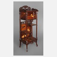 Frankreich, um 1900, unsigniert, wohl Ecole de Nancy, Gestell aus massivem Nussbaum profiliert und floral geschnitzt, alle Regalböden, Front und Rückwand fein intarsiert, mit floralen Motiven in verschiedenen Edelhölzern wie Rosenholz, Ebenholz, Ahorn und Mahagoni, normale Alters- und Gebrauchsspuren, Maße 152 x 60 x 41 cm.