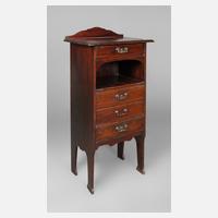 wohl England, um 1900, an den Schüben gemarkt Stone´s Patent, schlanker vierschübiger Korpus mit originalen, floral gestalteten Messingbeschlägen, einer nicht komplett, die Schübe mit automatisch ausklappbarer Front, Alters- und Gebrauchsspuren, Maße 110 x 57 x 37 cm.