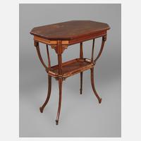 wohl Ecole de Nancy/Frankreich, um 1900, Mahagoni massiv, kleines Tischchen mit achteckiger Platte, auf sehr fein geschnitztem, floral verziertem Gestell, die Zwickel als Blütenkelche gestaltet, die leicht ausschwingenden Beine mit wellenförmiger Profilierung versehen, Oberfläche mit Altersspuren, sonst guter Zustand, Maße 71 x 66 x 42 cm.