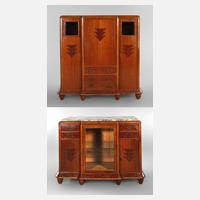 Frankreich, um 1930, in Mahagoni und Nussbaummaser furniert, dreitüriger Korpus mit vorgebautem Mittelteil, dieses mit facettgeschliffener Glasscheibe, die seitlichen Türen mit intarsierten überlappenden Dreiecken, darüber je zwei kleine Schubladen, eingelassene Marmorplatte, Glaseinlegeböden, guter Zustand, mit originalen Schlüsseln, Maße 108 x 143 x 60 cm, dazu Halbschrank, dieser mit drei Schubladen, die Türen mit drei überlappenden Dreiecken intarsiert, guter Zustand, mit Schlüssel, Maße 151 x 143 x 60 cm.