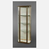 1930er Jahre, der schlichte Holzrahmen komplett mit gewölbten Messingprofilen verkleidet, die Seiten mit gebogenen Glasscheiben, Rückwand mit grobem Leinentuch bespannt, drei Einlegeböden an stufenlos verstellbarem Fachbodenhalter, mit Schlüssel, Maße 138 x 58 x 26 cm.