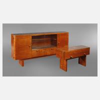 Deutschland, 1930er Jahre, kirschbaumfurniert, massiv gegossene halbrunde Bronzebeschläge, guter originaler Zustand, komplett mit Schlüssel, Glaseinlegeböden, normale Alters- und Gebrauchsspuren, H Anrichte 130 x B 260 x T 45 cm, H Sideboard 81 x B 137 x T 45 cm.