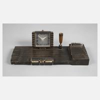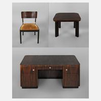deutsch um 1930, bestehend aus einem frei im Raum stellbarem Schreibtisch mit rückseitig integriertem Bücherregal, einem passendem Schreibtischstuhl und einem quadratischen Rauchtisch, alle Teile in Makassar furniert, Schreibtisch mit kreisrunden, vernickelten Beschlägen, normale Alters- und Gebrauchsspuren, Maße Schreibtisch 75 x 160 x 78 cm.
