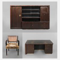 deutsch um 1940, Ausführung Werkstätten für Raumkunst Griese KG Chemnitz, bestehend aus zerlegbarem Bücherschrank mit Barfach, frei im Raum stellbarer Schreibtisch mit rückseitig integriertem Bücherregal sowie einem passendem Sessel mit verschlissenem Polster, alle Teile in Makassar furniert, innen mit Vogelaugenahorn und Mahagoni furniert, eingelassene runde Messingbeschläge, mit Schlüssel, normale Alters- und Gebrauchsspuren, Originalrechnung aus dem Jahre 1940 beiliegend, Maße Schrank 165 x 278 x 60 cm, Maße Schreibtisch 78 x 170 x 89 cm.