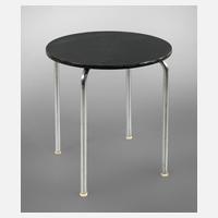 wohl 1950er Jahre, ungemarkt, verchromtes Gestell, mittig verschweißt, runde Holzplatte mit originalem schwarzen Schleiflack, leichte Alters- und Gebrauchsspuren, guter Zustand, H 160 cm, D 60 cm.