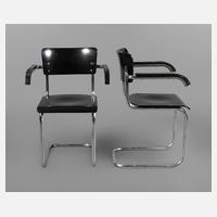 Entwurf Mart Stam 1931, Ausführung wohl Thonet 1930er Jahre, Stahlrohr verchromt, Sitz und Lehne aus schwarz lackiertem Schichtholz, Alters- und Gebrauchsspuren, Schrauben ergänzt, Chrom Z 2, Maße 80 x 52 x 50 cm.