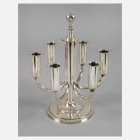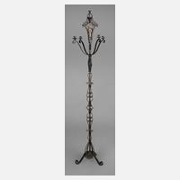 Frankreich, 1930er Jahre, feine Kunstschmiedearbeit, großer vierflammiger Standleuchter, in der Bekrönung eingearbeiteter tanzender weiblicher Akt aus versilbertem Messingguss, guter Zustand mit normalen Altersspuren, H 196 cm.