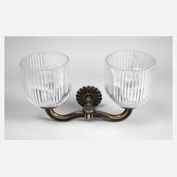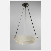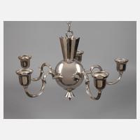 um 1925, schlankes verchromtes Metallgehäuse in Kegelform, mit drei c-förmig gebogten kurzen Leuchterarmen, insgesamt vierflammig elektrifiziert, die Schirme als Kreissegmente aus teils satiniertem Klarglas, minimale Altersspuren, H ca. 100 cm, D ca. 40 cm.