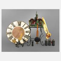 süddeutsch, 19. Jh., gemarkt L. Luar in Welshofen (bei Dachau), gusseisernes Gestell, mehrteilig verschraubt, in Rot, Grün und Gold gefasst, Werk mit Amanthemmung, welche direkt am oberen Teil des Pendels befestigt ist, Antrieb über drei Gewichte, beigegeben großes Blechziffernblatt, Kurbel, drei Gewichte und zwei Zeigerpaare, Funktion nicht geprüft, auf späterem schmiedeeisernen Gestell, Maße mit Gestell 134 x 55 x 34 cm.
