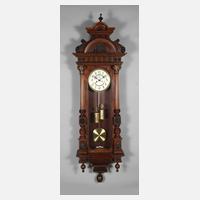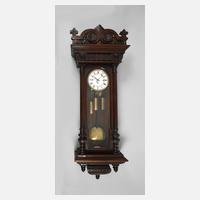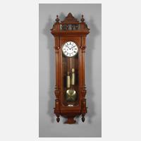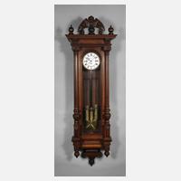 um 1880, dreiseitig verglastes Nussbaumgehäuse mit beschnitzter Bekrönung (vermutlich ergänzt), trapezförmiges Messingplatinenwerk mit Flügelradmarke, Werk mit Halbstundenschlag auf Tonstab, makelloses Emailleziffernblatt mit römischen Ziffern, zwei Zierteile lose beigegeben, Werk läuft, Gehäuse etwas rest.bed., H 130 cm.