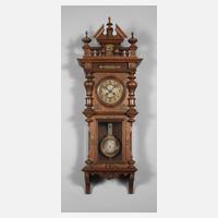 deutsch, um 1880, auf der Platine gemarkt B&W, Werk mit Halbstundenschlag auf Tonspirale, Prunkgehäuse aus Nussbaum, Metallziffernblatt mit vergoldeten Messingapplikationen verziert, Gehäuse mit minimalen Fehlstellen, ohne Bekrönung, Rückwand mit Trocknungsriss, funktionstüchtig, H 80 cm.