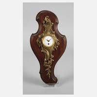 um 1890, fein ziseliertes Bronzegehäuse in Rocaillenform auf Mahagoniplatte montiert, makelloses Emailleziffernblatt mit farbigen Festons verziert, funktionstüchtig, guter Zustand, H 38 cm.