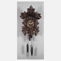Schwarzwald, Anfang 20. Jh., Messingplatinenwerk mit drei Gewichten, Viertelstundenschlag über Kuckuck und Wachtel, Ziffernblatt mit römischen Ziffern aus Kunststoff und Zeiger aus Bein, Ziffern teilweise unvollständig, Tür des Kuckucks schließt nicht richtig, sonst funktionstüchtig, Maße 70 x 43 x 23 cm.