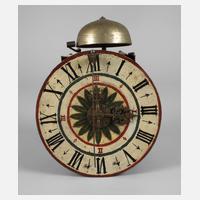 wohl süddeutsch, 18. Jh., bemaltes rundes Eisenschild, Vorderzappler mit Kurzpendel, Werk mit Spindelhemmung und Halbstundenschlag auf oben liegende Glocke, originale Weckscheibe und Zeiger aus Messing, zwei Gewichte, Gewichte und eine Schnur fehlen, Bemalung erneuert, D 23 cm.