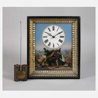 Mitte 19. Jh., lithografiertes und ausgemaltes Hinterglasbild, Darstellung eines Jägers auf Gamsjagd, Holzplatinenwerk mit zwei Gewichten, Halbstundenschlag auf Tonspirale, funktionstüchtig, Maße 38 x 33 x 13 cm.
