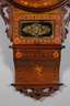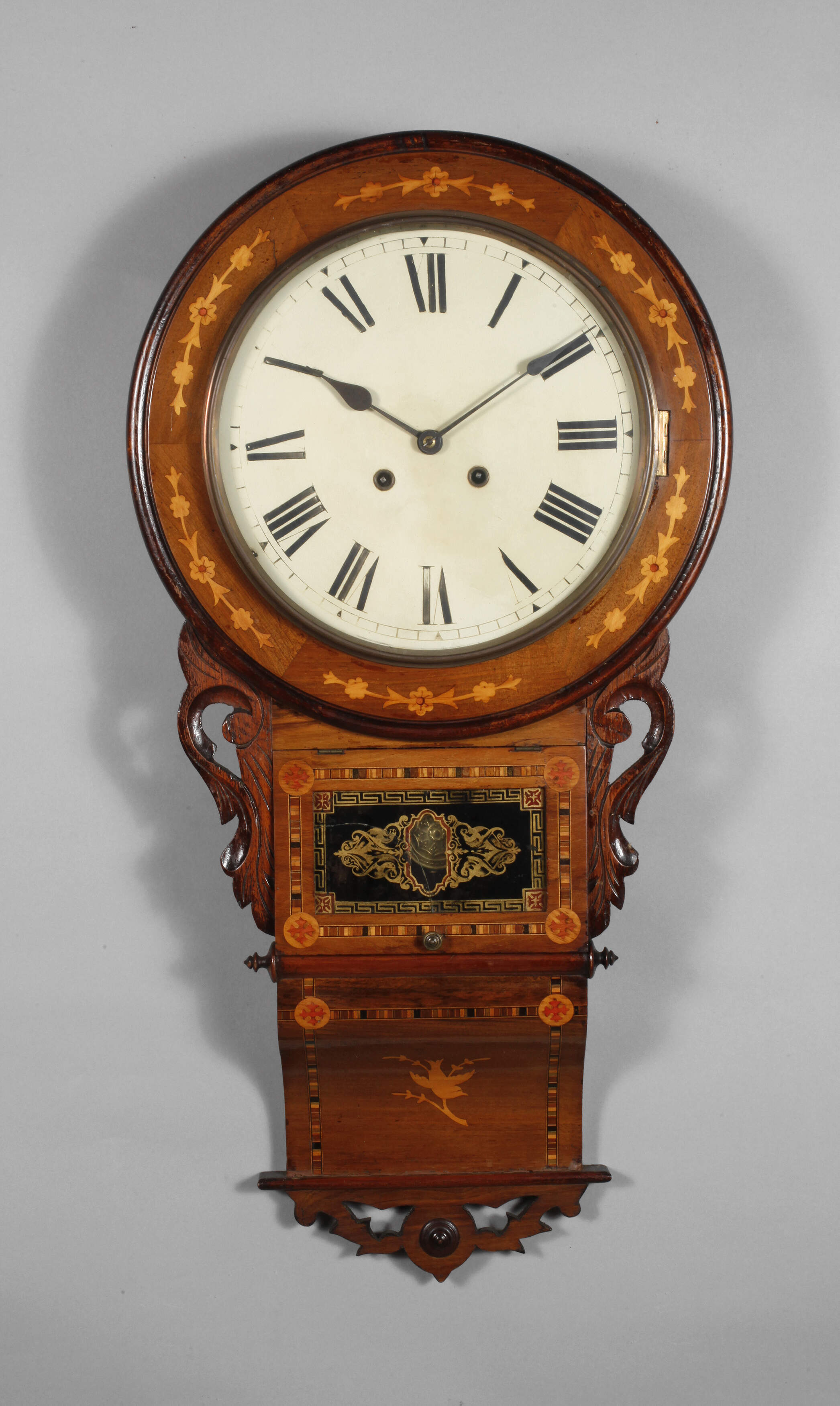 Ende 19. Jh., innen auf Papieretikett gemarkt Anglo-American Clocks, New Heaven Trademark USA, intarsiertes Nussbaumgehäuse, Blechziffernblatt, Achttagewerk mit Schlag auf Tonfeder, Glasscheibe gesprungen, ein Zierteil lose, funktionstüchtig, H 80 cm.