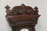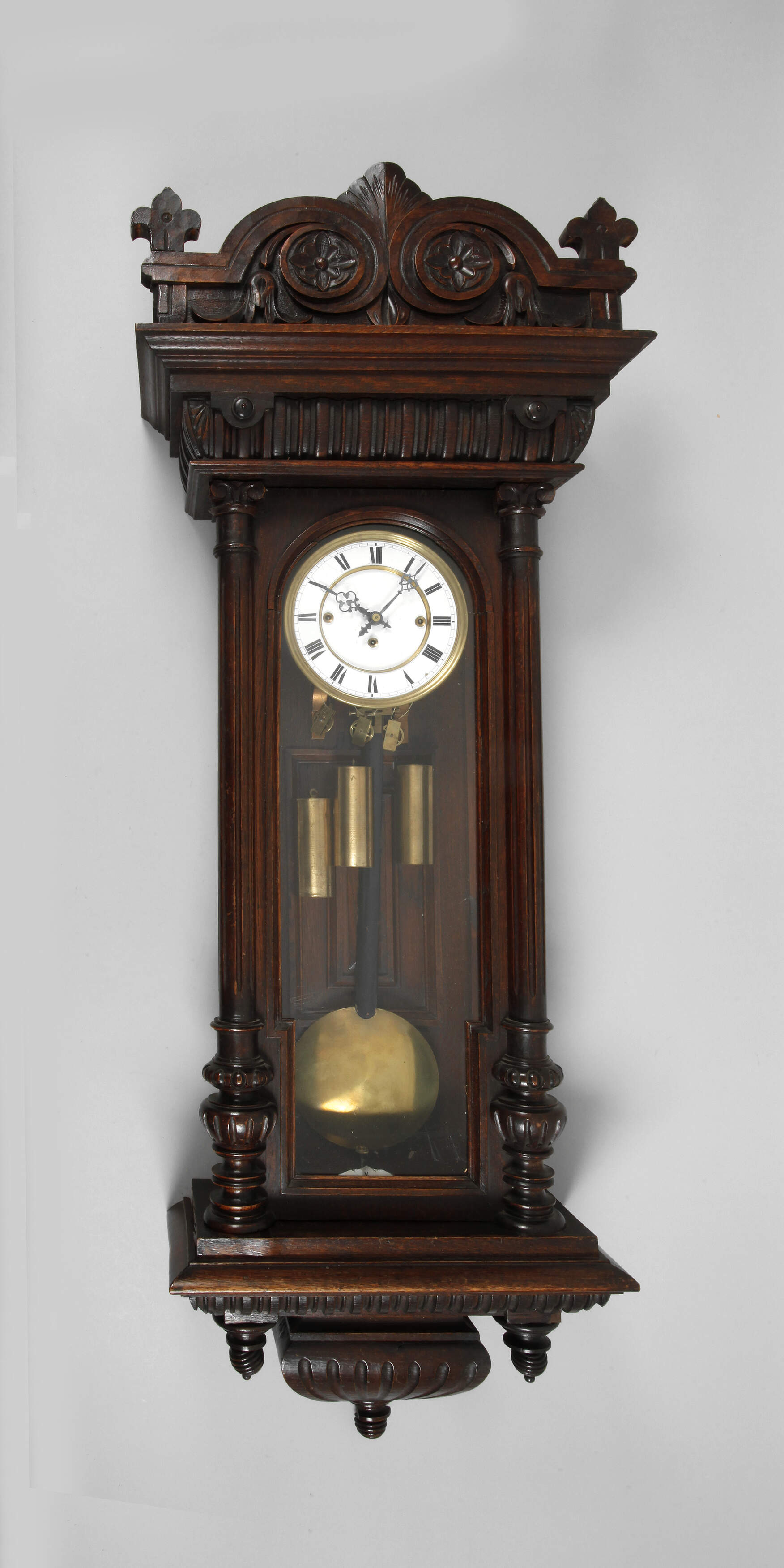 deutsch, um 1870, dreiseitig verglastes Nussbaumgehäuse mit originaler Bekrönung, Werk mit drei Gewichten und Viertelstundenschlag auf zwei Tonfedern, emailliertes Ziffernblatt mit römischen Zahlen und Haarriss, Messinggewichte und Pendellinse, funktionstüchtig, H 131 cm.