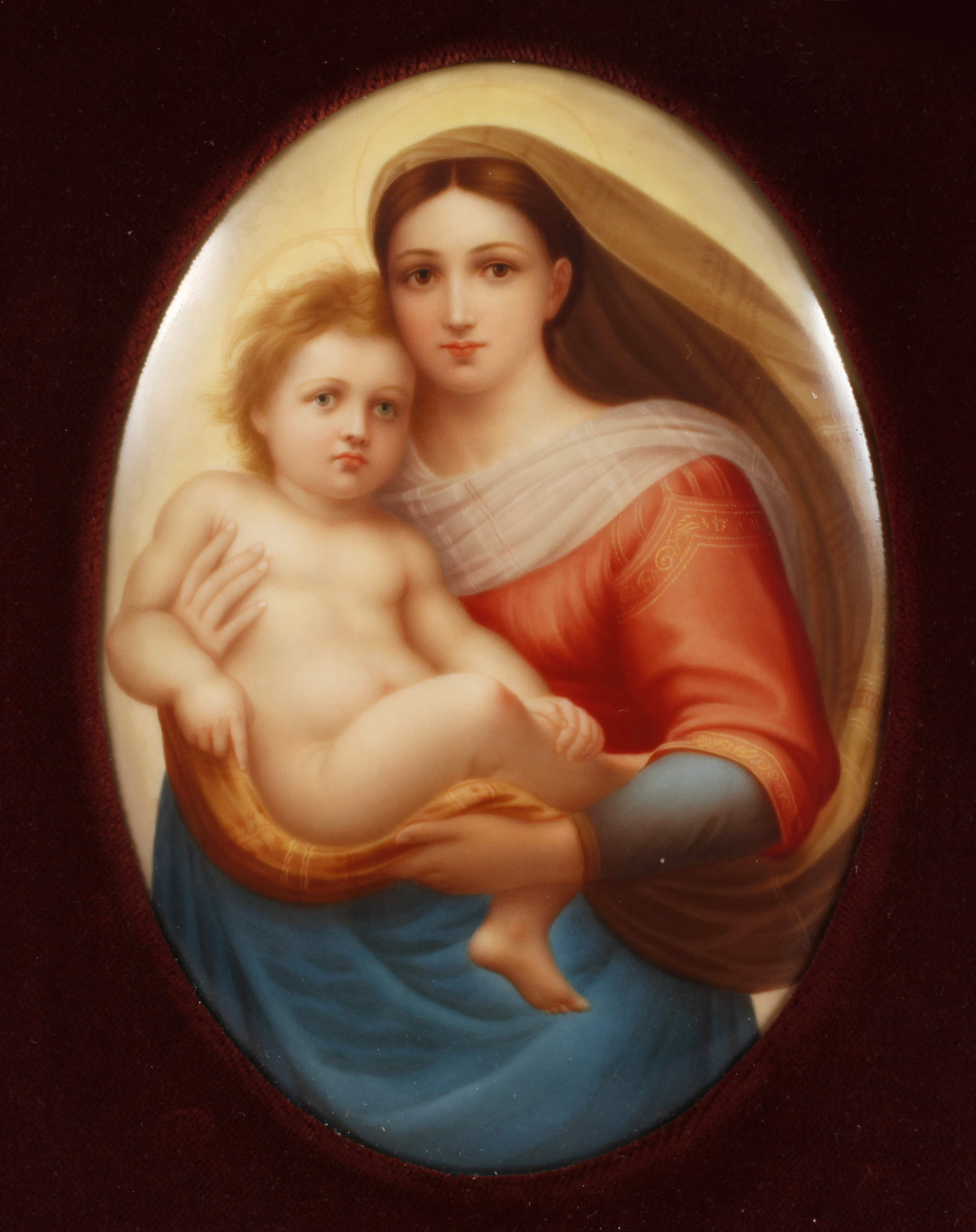 Anfang 20. Jh., Pressmarke ab 1825, Prägenummer 3 sowie Monats- und Jahreszeichen für 1909, ovale gewölbte Porzellanplatte mit äußerst feiner Aufglasurbemalung, Hüftstück Mariens mit Kind, nach dem berühmten Gemälde von Raffael (1483–1520), rechts unten, teils verdeckt signiert Vetter?, laut Einlieferer der Lauschaer Porzellanmaler Gustav Greiner-Vetter (1879–1944), in Goldleiste hinter Passepartout aus bordeauxfarbenem Samt montiert, sonst guter altersgemäßer Zustand, Maße Platte 16,5 x 12 cm, Maße Rahmen 35 x 30 cm.