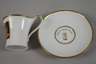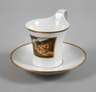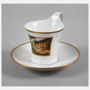 jeweils unterglasurblaue Zeptermarken um 1820/30, ungedeutete Pinselzeichen, Tasse in Kalathosform mit Campanerhenkel, schauseitig Rechteckkartusche mit humoresker Szene in feiner polychromer Aufglasurbemalung, Darstellung eines im Baumschatten ruhenden Fauns, dieser mit erhobenen Zeigefinger auf den vor Bienen flüchtenden Putto weisend, nicht ganz passend ergänzte Untertasse mit Stundenglas und Umschrift "Andenken fröhlicher Stunden." ebenfalls mit Goldrändern verziert, Tassenmündung links vom Motiv fachmännisch restauriert und Untertasse kratzspurig, H gesamt 10 cm.