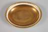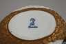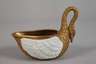 unterglasurblaue Stempelmarken ab 1901, Prägenummer A67097, ovale Form, als plastischer Schwan in Biskuitporzellan mit reliefiertem Federkleid und Schwanenhals als Henkel, dazugehörige ovale Untertasse mit reliefiertem Spitzbogenfries, beide Teile mit fast kompletter Vergoldung in Goldbronze, Untertasse minimalst kratzspurig, sonst guter Zustand, H komplett 9,5 cm.