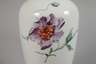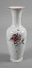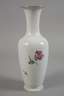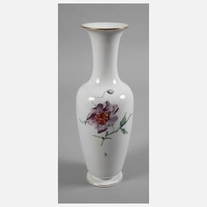 unterglasurblaue Zepter- und rote Reichsapfelmarke 1870–1945, undeutliche Prägezeichen und Pinselnummer, schlanke Balusterform mit Scheibenfuß und Kraterhals, beidseitiger Dekor aus Mohn- bzw. Heckenrosenblüte mit Falter in feiner polychromer Aufglasurbemalung sowie Goldränder, drei winzige Brandflecke am Hals und Mündung, mit Flohbiss, H 33,5 cm.