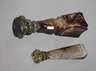 Ende 19. Jh., bestehend aus zwei Briefmessern, zwei Petschaften sowie Federhalter, die Griffstücke aus bräunlichem Bandachat gefertigt, Montierungen aus Silber bzw. Messing, teils aufwendig ziseliert, Stempelflächen mit Monogramm, Alters- und Gebrauchsspuren, L max. 18,5 cm.