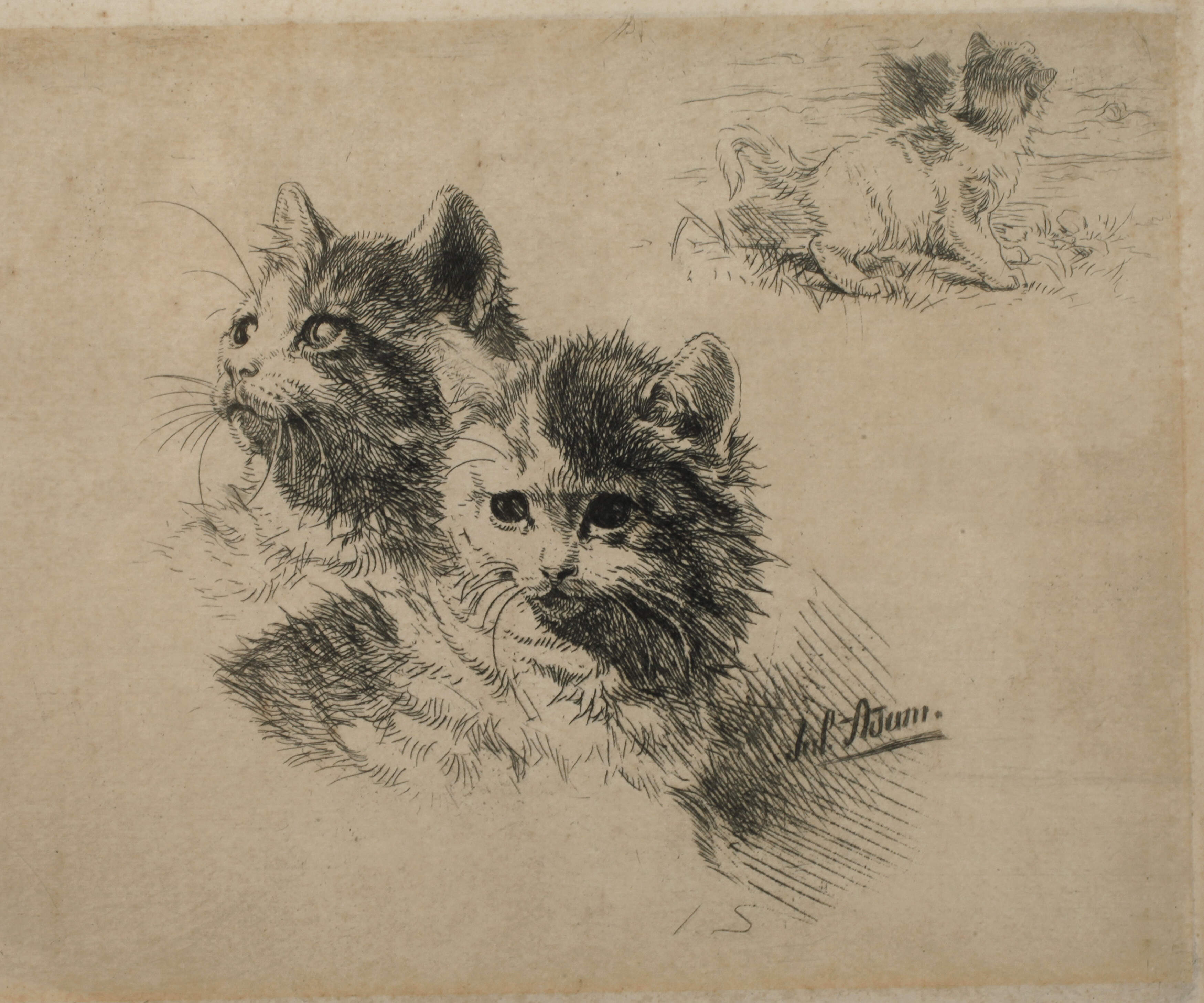 poesievolle Darstellung dreier Katzen, Radierung, um 1900, rechts unten in der Platte signiert "Jul. Adam", gering fleckig, hinter Glas und Passepartout gerahmt, Plattenmaße ca. 10,5 x 15 cm. Künstlerinfo: eigentlich Julius Anton Adam, genannt "Katzen-Adam" bzw. "Katzenraffael", dt. Genre- und Tiermaler sowie Lithograph und Fotograf (1852 München bis 1913 München), Mitglied der Münchner Malerfamilie Adam, Sohn und Schüler des Fotografen und Lithographen Julius Adam dem Älteren (1821–1874), zunächst Ausbildung zum Landschaftsfotograf und Eintritt ins väterliche Fotoatelier, 1866–72 als Fotograf und Fotoretuscheur in Rio de Janeiro, ab 1872 Schüler an der Münchner Kunstgewerbeschule bei Michael Echter, 1873–82 Studium an der Akademie in München bei Johann Leonhard Raab und Meisterschüler bei Wilhelm von Diez, nachfolgend intensive Beschäftigung mit der Tiermalerei und hier besonders der Darstellung von Katzen, 1904 Silbermedaille auf der Weltausstellung St. Louis, 1905 erhielt er für seine Katzenbilder auf der Internationalen Kunstausstellung in München die Goldmedaille, zum Professor ernannt, beschickte Ausstellungen in Berlin und München, tätig in München-Gern, Quelle: Thieme-Becker, Saur "Bio-Bibliographisches Künstlerlexikon", Bötticher "Malerwerke des 19. Jh.", Bruckmann "Münchner Maler des 19./20. Jh.", Matrikel der Münchner Akademie, Dressler, Müller-Singer und Wikipedia.