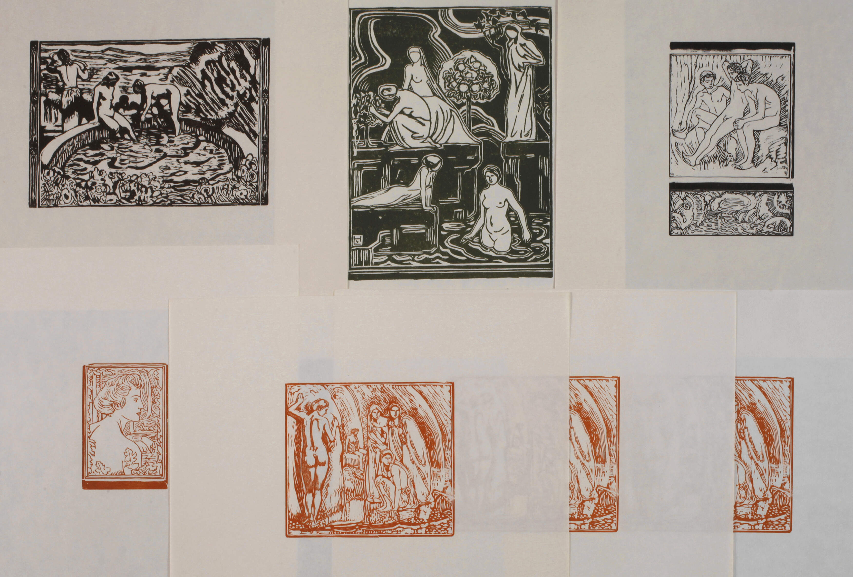 bestehend aus sechs Darstellungen von Badeszenen (ein Motiv dreifach) und Portrait einer jungen Frau im Profil, Holzschnitte in Rot, Dunkelgrün und Schwarz auf Papier, um 1910-20, posthume Abzüge, ein Blatt im Stock monogrammiert, Darstellungsmaße max. ca. 21,5 x 16,5 cm, Blattmaße ca. 32 x 28 cm. Künstlerinfo: bedeutender dt. Maler, Graphiker und Kunstgewerbler (1861 Darmstadt bis 1945 Pillnitz bei Dresden), studierte 1883-86 an der Akademie Dresden bei seinem Onkel Heinrich Hofmann (1824-1911) und Friedrich Preller dem Jüngeren (1838-1901), 1886-88 an der Akademie Karlsruhe, hier Meisterschüler von Ferdinand Keller, anschließend kurzzeitiger Studienaufenthalt in München, 1889-90 an der Académie Julian Paris und beeinflusst von Pierre Puvis de Chavannes (1824-1898), ab 1890 freischaffend in Berlin und neben Lovis Corinth, Max Liebermann, Max Klinger und Walter Leistikow Mitglied der Vereinigung der "Elf", unterhielt Freundschaften zu Gerhart Hauptmann und Eugen Bracht, 1894-1901 Studienreisen und -aufenthalte unter anderem in Rom, Neapel und beeinflusst vom Werk Hans von Marées (1837-1887), 1895 Reise nach Kleinasien (Griechenland und Türkei) mit seinem Onkel und künftigem Schwiegervater Reinhard Kekulé von Stradonitz (1839-1911), ab 1895 für die Zeitschrift „Pan“ tätig, 1898 Gründungsmitglied der Berliner Sezession, ab 1903 Professor an der Kunstschule Weimar und Vorreiter von Harry Graf Kesslers Bewegung “Neues Weimar”, 1903-14 Sommerhaus in Fiesole bei Florenz, 1907 Griechenlandreise mit Gerhart Hauptmann, 1916-31 Professor an der Akademie Dresden und wohnhaft in Dresden-Pillnitz, korrespondierendes Mitglied der Münchner Sezession, Mitglied des Deutschen Künstlerbundes Weimar, zum Dr. phil. h.c. und Geheimen Hofrat ernannt, in zahlreichen Museen vertreten, 1937 teilweise als “entartet” diffamiert, Quelle: u. a. Thieme-Becker, Vollmer, Dressler und Wikipedia.
