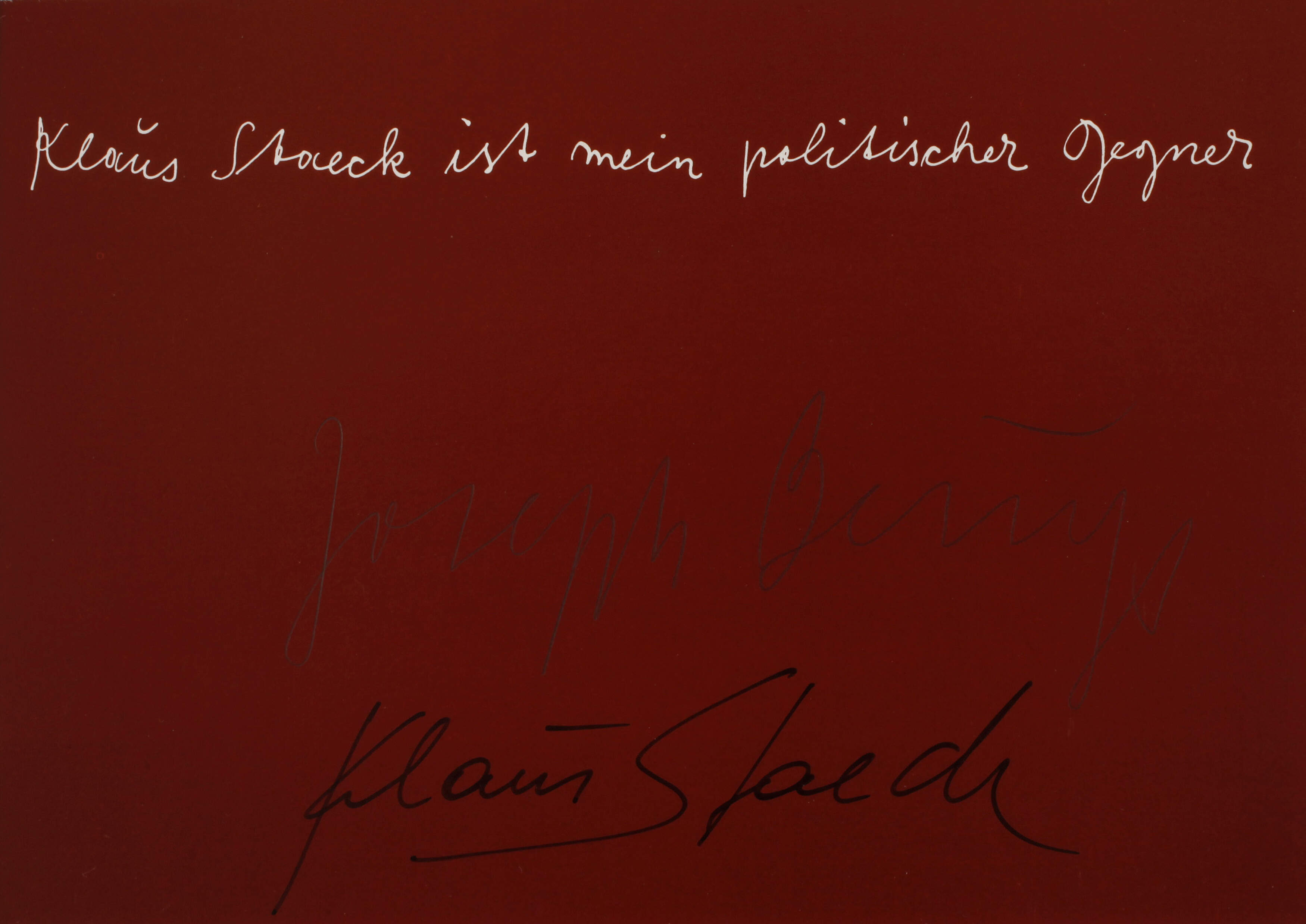 erschienen als Postkarte in der Edition Staeck, auf rotem Grund Schriftzug "Klaus Staeck ist mein politischer Gegner" und gedruckte Signatur "Klaus Staeck", 1973, mittig in Blei signiert "Joseph Beuys", unter Passepartout und hinter Glas gerahmt, Passepartoutausschnitt ca. 10 x 14 cm. Künstlerinfo: dt. Aktionskünstler, Bildhauer, Zeichner und Kunsttheoretiker (1921 Krefeld bis 1986 Düsseldorf), 1941 Bekanntschaft mit Heinz Sielmann während des Kriegsdienstes, 1946 Mitglied des Klever Künstlerbundes, studierte 1946–53 Monumentalbildhauerei an der Akademie Düsseldorf bei Joseph Enseling, ab 1948 bei Ewald Mataré und 1951–54 dessen Meisterschüler, parallel 1947–49 Mitarbeit bei Dokumentarfilmen von Heinz Sielmann, 1954–58 eigenes Atelier in Düsseldorf-Heerdt, 1958–64 Atelier im alten Klever Kurhaus, 1959 entsteht letztes konventionelles Kunstwerk, anschließend vor allem Kunsttheoretiker und ab 1963 als Aktionskünstler bedeutender Vertreter des Fluxus, ab 1961 in Düsseldorf-Oberkassel ansässig, 1961–72 Professor für monumentale Bildhauerei an der Akademie Düsseldorf, etabliert hier 1966–72 seine „Ringgespräche“, 1972 Entlassung aus dem Hochschuldienst wegen wachsender Differenzen mit dem Wissenschaftsministerium, durfte nach Klage jedoch seinen Professorentitel und sein Atelier „Raum 3“ an der Akademie bis zum Erreichen des 65. Lebensjahres behalten, hier 1980 zusammen mit Klaus Staeck, Willi Bongart und Georg Meistermann Gründung der „Freien Internationalen Hochschule für Kreativität und interdisziplinäre Forschung (FIU)”, regelmäßige Teilnahme an der documenta in Kassel, 1974 Vortragsreise durch die USA, 1976 auf der Biennale Venedig, 1979 Bekanntschaft mit Andy Warhol, 1979 Retrospektive im Guggenheim-Museum New York, 1981 Romaufenthalt und Polenreise, in zahlreichen Museen vertreten, Quelle: Vollmer, AKL und Internet.