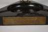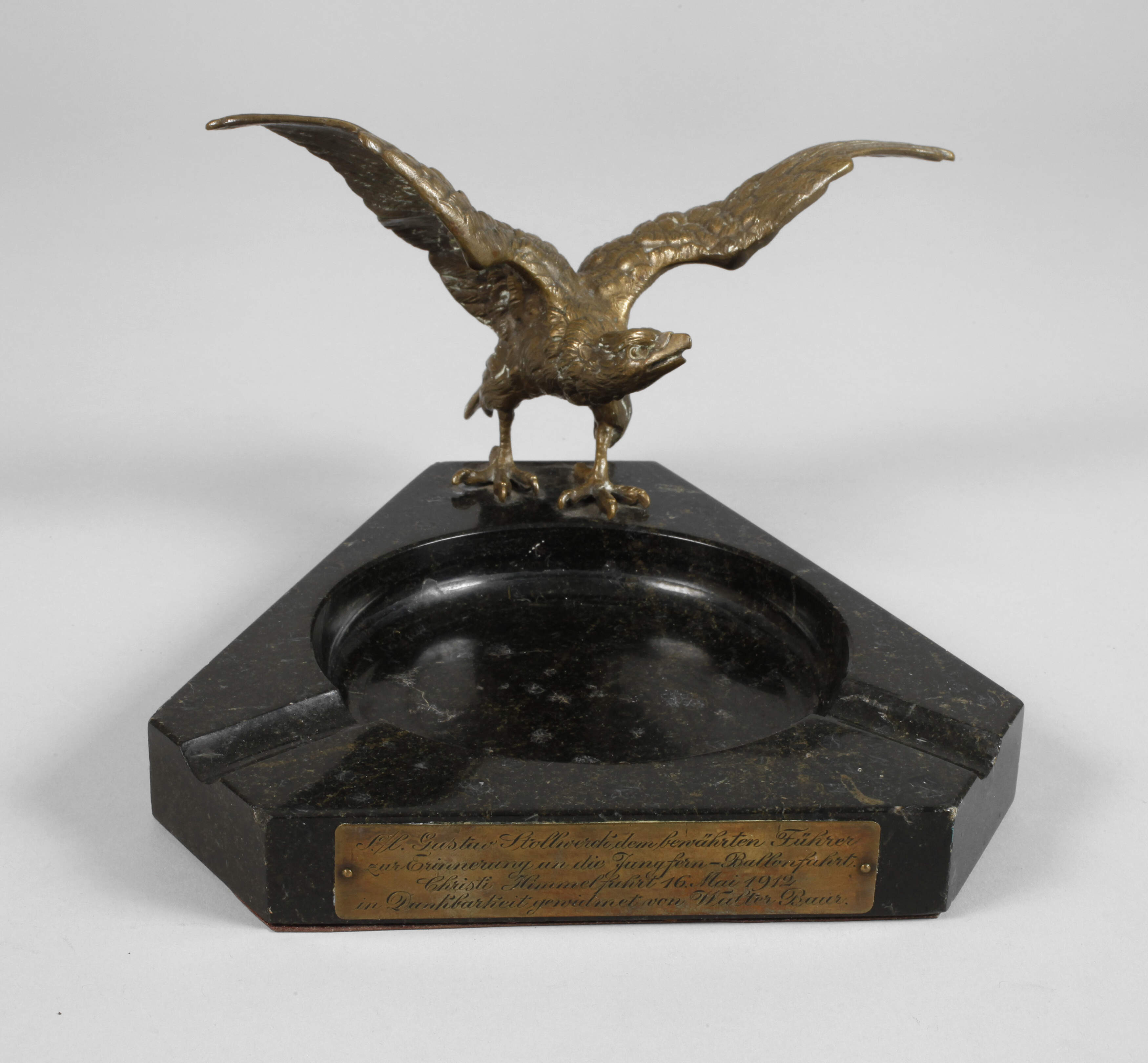 datiert 1912, gravierte Messingplakette mit Dedikation Gustav Stollwerck dem bewährten Führer zur Erinnerung ..., gewidmet von Walter Baur, abgekantete Schale aus dunkelbraunem Serpentin, aufgesetzter Adler aus fein ziselierter Bronze, minimal bestoßen, Altersspuren, L 23 cm.