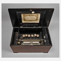 Anfang 20. Jh., langrechteckiges Gehäuse in Kirschbaum furniert, eingelassenes Spielwerk, nummeriert 30213, mit intaktem Stimmkamm, originaler Kurbel und einer beigegebenen Platte, Werk läuft an, reparaturbedürftig, Alters- und Gebrauchsspuren, Maße 21 x 40 x 26 cm.