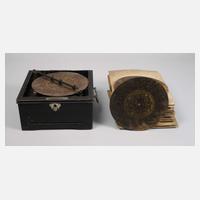 um 1900, geschwärztes Weichholzgehäuse mit kannelierten Vollsäulen, Front mit graviertem Etikett, mit Kurbel, Werk läuft an, restaurierungsbedürftig, dazu drei Platten, Maße 26 x 47 x 37 cm.