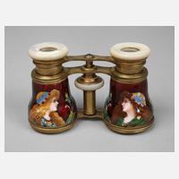 um 1900, gemarkt Wilhelm Pfeiffer Freiburg i. B., Messinggehäuse mit aufgesetzten Zierelementen aus Perlmutt, fein emaillierte Darstellung zweier junger Schönheiten, funktionstüchtig, Alters- und Gebrauchsspuren, im originalen Etui.