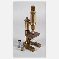 Anfang 20. Jh., gemarkt E. Leitz Wetzlar, Seriennummer 28403 sowie undeutliches Besitzermonogramm HL?, goldbronziertes Eisengussgestell mit einfachem, mehrfach ausziehbarem Revolver, beigegeben Wechselokular, Alters- und Gebrauchsspuren, H 28 cm.