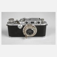 Mitte 20. Jh., gemarkt Ernst Leitz Wetzlar, Seriennummer 304375, lederummanteltes Metallgehäuse, Objektiv gemarkt Elmar 1:3,5 F=50 mm, stärkere Gebrauchsspuren, funktionstüchtig, im Etui.