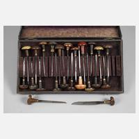 19./20. Jh., 23 Stück, größtenteils unterschiedlich gemarkt, darunter J. Rubin Paris, G. Neumann Berlin, Vautier, Renard France und weitere, Werkzeug zur Handgravur, verschiedene Größen und Formen, im Etui, Alters- und Gebrauchsspuren, L max. 14,3 cm.