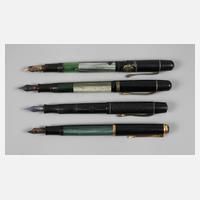 Mitte 20. Jh., Füllfederhalter, drei gemarkt Pelikan sowie einer Melbi Transparent, zwei davon mit Goldfeder gestempelt 14 C bzw. 585, alle im Kunststoffgehäuse mit vergoldeten Metallteilen, einer mit stärkeren Erhaltungsmängeln, die anderen mit normalen Alters- und Gebrauchsspuren, L max. 12,5 cm.