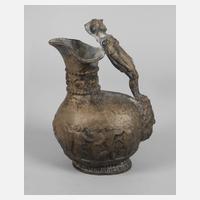 unbestimmten Alters, rötlicher Fayencescherben, matt bemalt, mit Resten alten Belags, ovale Form, reich dekoriert mit Festons, tanzenden Figuren, Delfinen, Perlbändern und Festons mit Widderköpfen, der Henkel als korinthischer Krieger um Christi Geburt, auf einem Maskaron stehend, Henkel geklebt und kleine Fehlstellen, H 22 cm.