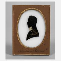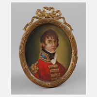 Mitte 19. Jh., in Eglomisé-Technik angefertigte Hinterglasmalerei, laut beigegebener Information des Einlieferers Profil des Commandeurs des II. Großherzoglichen S. Linien-Infanterie-Bataillons zu Eisenach, in geschwärzter Leiste gefasst, Maße 13 x 10,5 cm.
